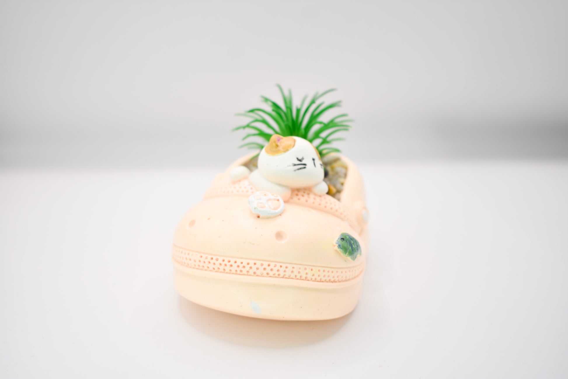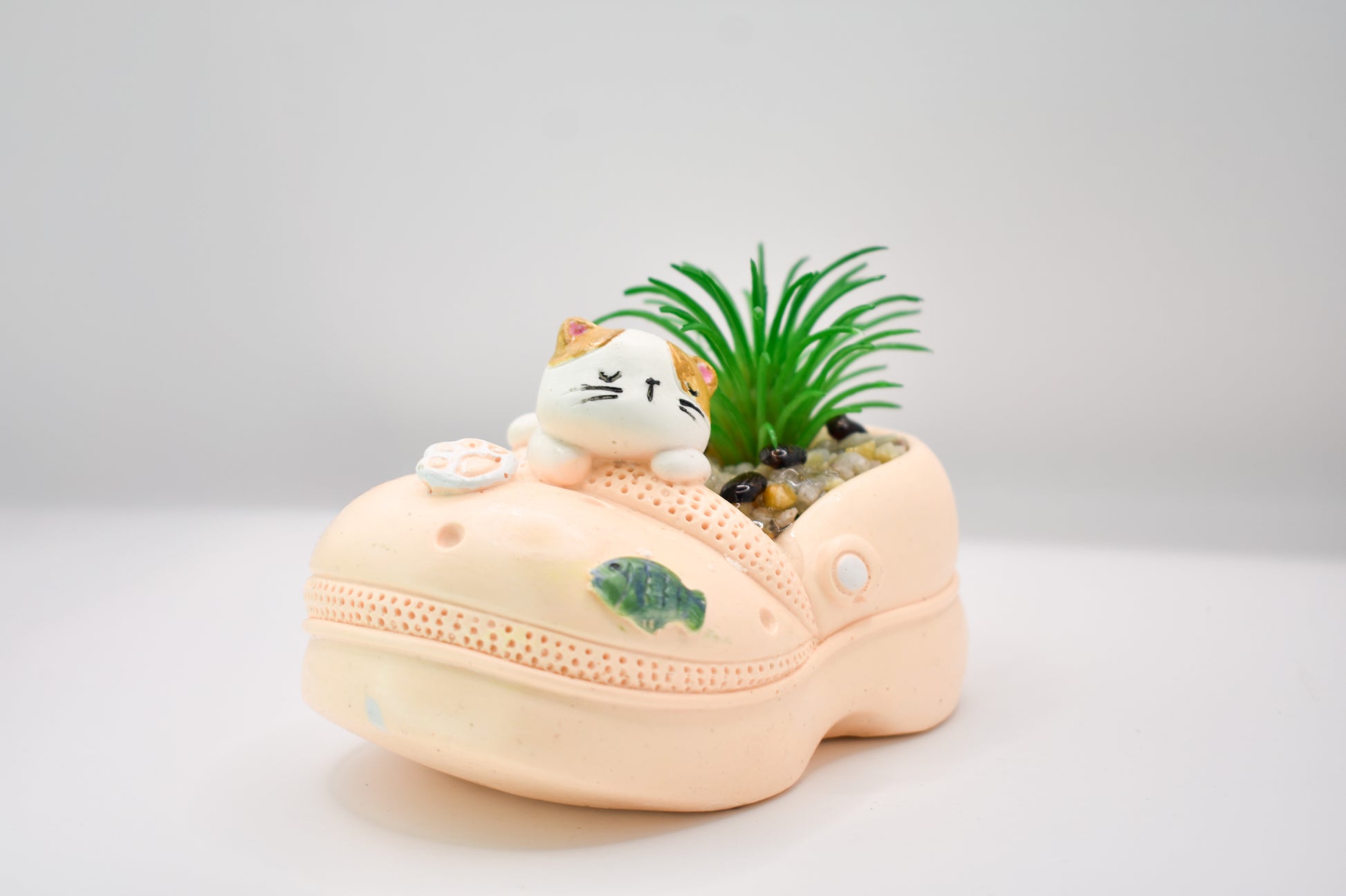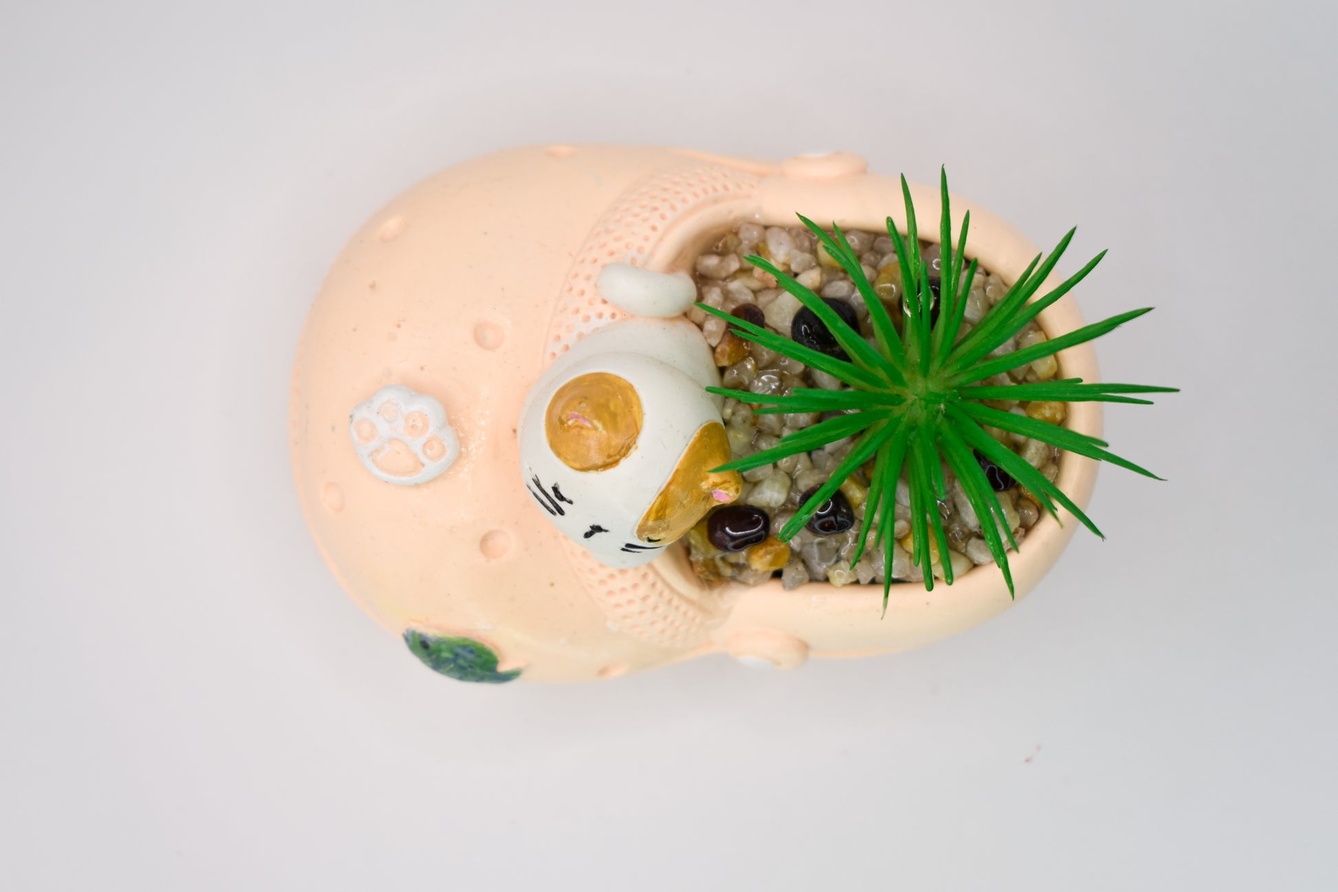 Meet Puddy Tat, the sneaky little cat peeking out of a croc-shaped container! This quirky and adorable planter brings a pop of fun and personality to any space—no watering required, just endless smiles.